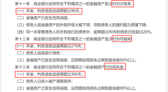 从逾期天数来看,《办法》明确规定,金融资产逾期后应至少归为关注类,逾期超过90天、270天应至少归为次级类、可疑类,逾期超过360天则应归为损失类。