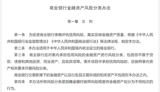 《办法》显示,商业银行应对表内承担信用风险的金融资产进行风险分类,包括但不限于贷款、债券和其他投资、同业资产、应收款项等。表外项目中承担信用风险的,应按照表内资产相关要求开展风险分类。