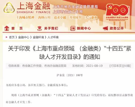 2021年8月19日,上海市地方金融监督管理局印发《上海市重点领域(金融类)“十四五”紧缺人才开发目录》。文件对上海金融人才的紧缺类型、紧缺程度进行了指引,旨在进一步加大对上海金融发展紧缺急需人才的吸引、集聚和培养开发力度,为上海国际金融中心建设在新起点上迈向更高发展水平提供坚强的人才保障和智力支撑。