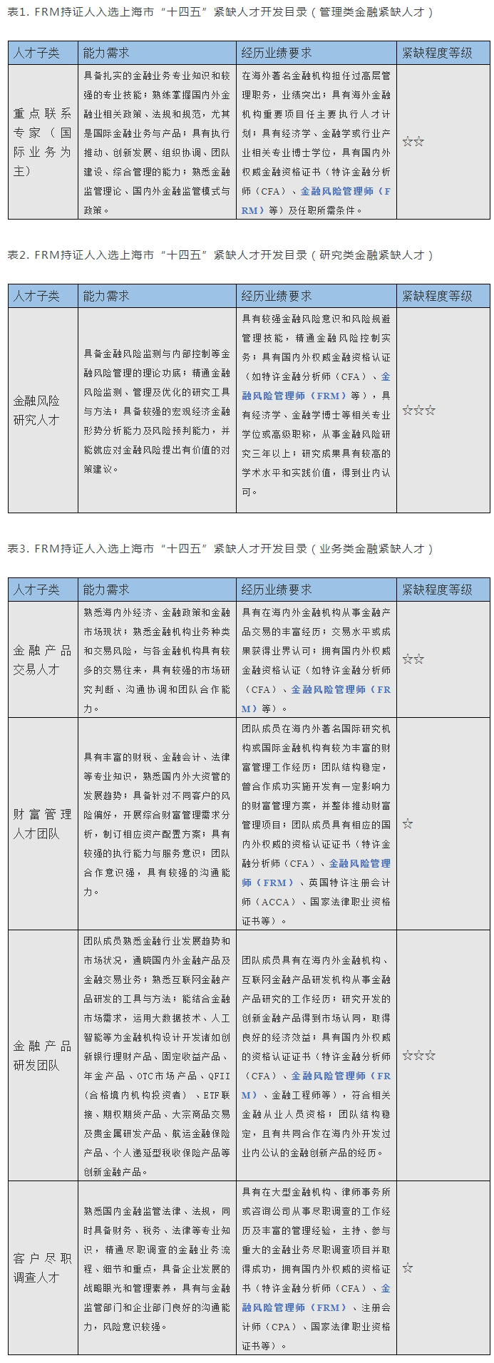 文件中明确指出,将取得国际权威的资格认证证书 - 金融风险管理师(FRM)列入“管理类金融紧缺人才”、“研究类金融紧缺人才” 、“业务类金融紧缺人才”三项人才大类,共计6项人才子类(见下表)。